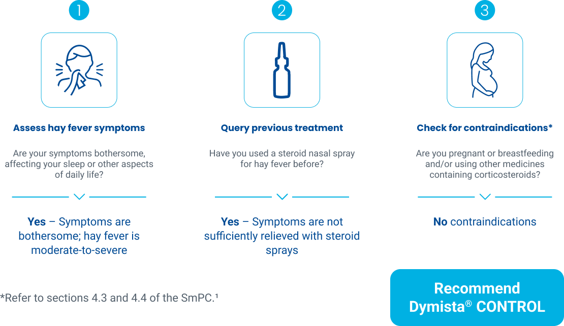 If hay fever symptoms persist after 7 days of using Dymista® CONTROL, the patient should visit their GP to rule out alternative diagnosis.1