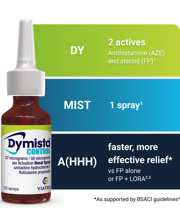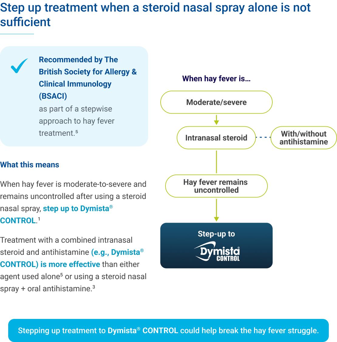 • As recommended by The BSACI, when hay fever is moderate-to-severe and remains uncontrolled, step up to a combined nasal spray (e.g., Dymista® CONTROL)5